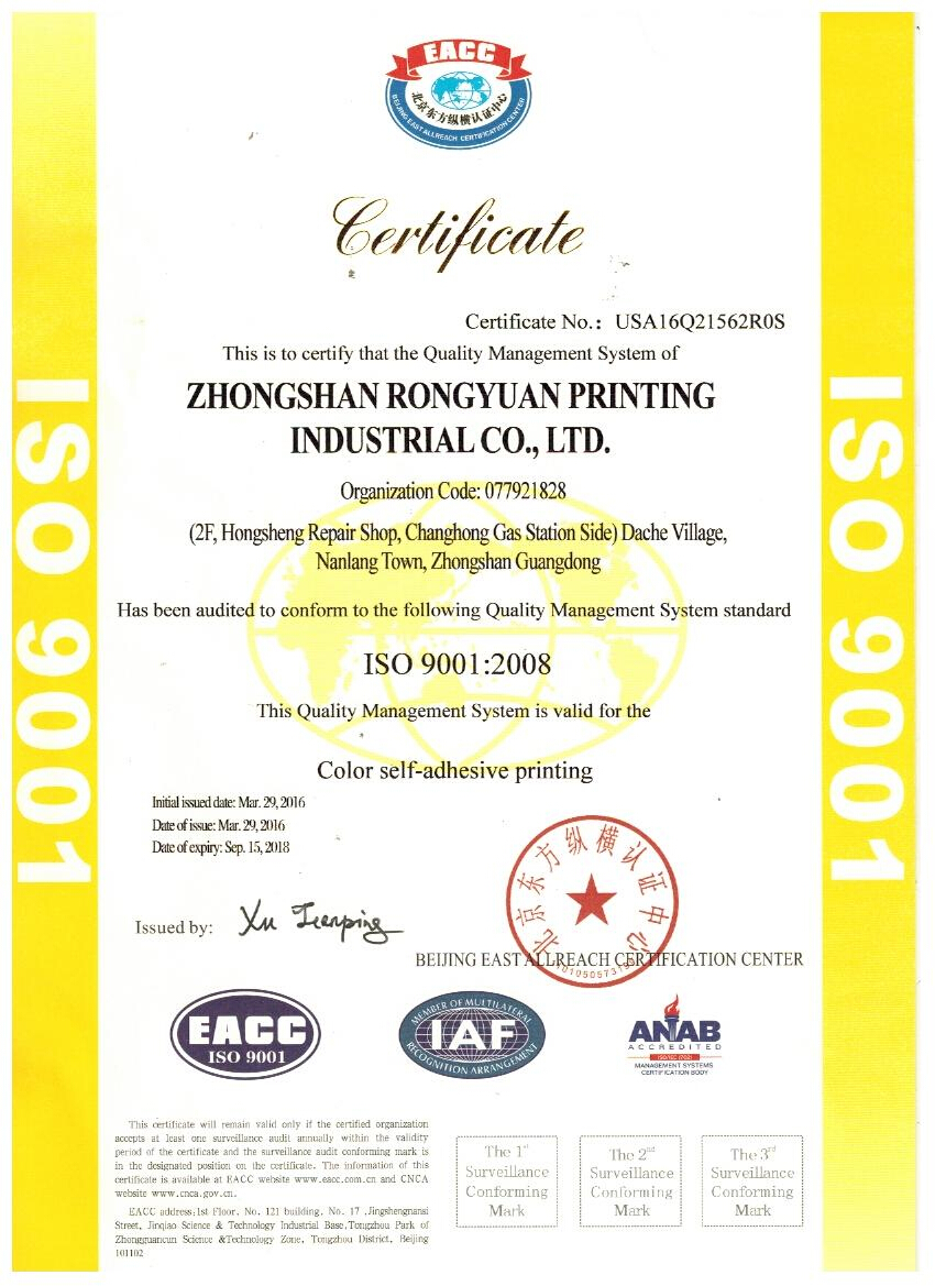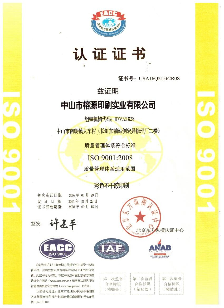 2016年3月接受了北京东方纵横认证中心审核专家组对质量管理体系的全面检查与审核,并成功通过ISO9001:2008国际质量体系认证,获得由北京东方纵横认证中心颁发的国际质量体系证书。这标志着榕源公司以ISO质量管理体系为依托,以制度、机制健全完善为根本,积极推进管理创新和严格产品质量控制程序,取得了一定成效。